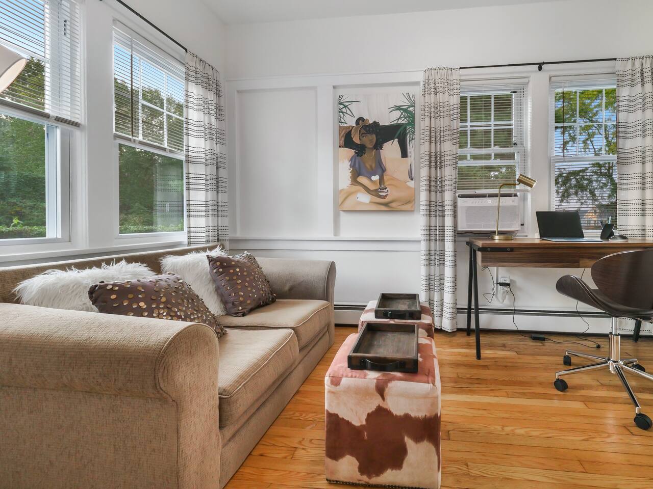 Located on the 1st floor of a charming home. Enjoy natural light inside this mid-century modern designed space, or step out onto the deck to watch the sunrise over the Hudson River and Mount Beacon! Bedroom #1 * Queen Bed - Helix luxury mattress * Attached Den/Office with Desk with notepad, pens & pencils and sofa and large mirrored closet * Cell phone chargers * Dresser * corner chair Bedroom #2 * Queen Bed - Helix luxury mattress * Cell phone chargers * Desk with notepad, pens & pencils * Dresser * closet * full length mirror The space includes: *fully-equipped kitchen with cooking and baking essentials *coffee bar (K-cups, tea, sugar and creamers provided) * living room with smart TV & Bluetooth speaker *dining table can also be used as a workspace. There are twp security cameras: -outside at the backdoor by the deck - outside on the side of the home .